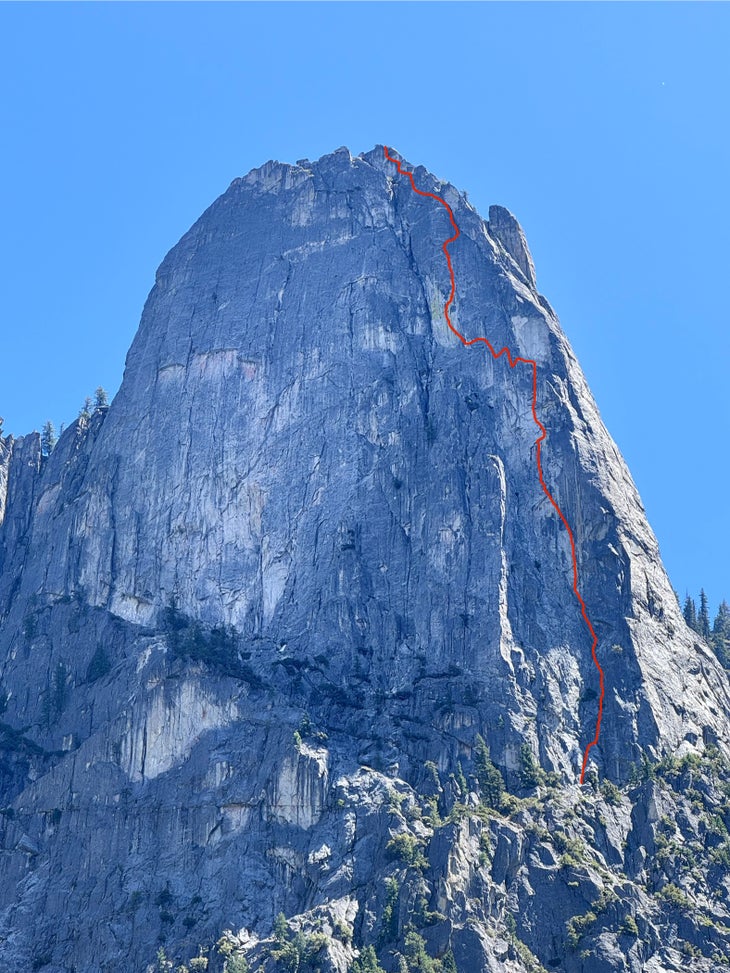 To add anchors to the new terrain, Taylor drilled 33 fixed anchor pieces using a combination of bolts and rivets, with fixed keyhole hangers left in the hopes of increased longevity for future ascents. She had to be careful not to dislodge any large loose rocks with the start of the Steck-Salathé and the popular Four Mile Trail below, making some of the pitches extra stressful. Taylor climbed for six days to establish the route, spending a night on the summit and hiking everything down on the seventh day.