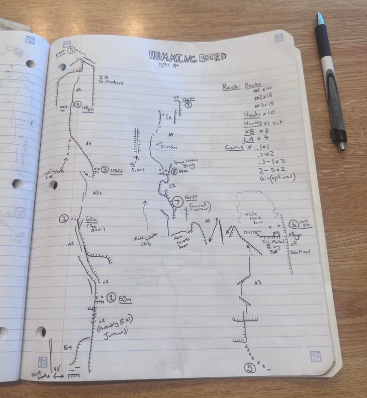 Hummingbird crosses over Flying Buttress Direct (5.10 C2) twice, but Taylor estimates her route to be more than 90% independent terrain. It covers 1600 feet in 13 pitches, 11 of which are previously unclimbed. To her delight, the moves proved to be quite technical. In a slightly giddy tone, she tells me that “several of the pitches required hammering more than twenty or twenty five beaks,” much more than the handful required for your typical Yosemite big wall route. She proposes a grade of A4 5.9+, with one A4 pitch and six A3 or A3+ pitches.