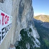 This is the third flag-related protest in El Capitan in the past 12 months. On June 17, 2024, pro-Palestinian climbers unfurled a 25-foot “Stop the Genocide” banner on El Cap Tower to protest Israel’s U.S.-supported bombardment of civilians in Gaza. Then, on February 22, 2025, seven current and ex-NPS employees dropped an upside-down American flag between the top of El Cap’s Zodiac route and Horsetail Falls to protest the indiscriminate firing of 1,000 NPS employees and warn the public about threats to public lands.