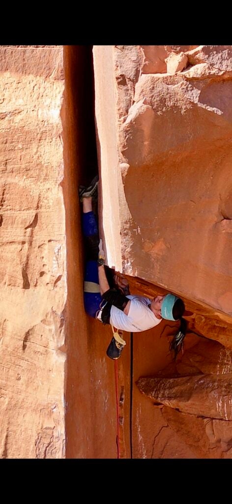 We won’t pretend to know what the “right” course of action really was for this fall. Surely sliding down that slab for another 30 feet—and skidding into a ledge, or the ground—would have been heinous. However, we must point out that Krause was extremely lucky to not de-glove his finger by grabbing the quickdraw in this fall. Krause experienced the absolute best-case scenario for a fall of this length and style.