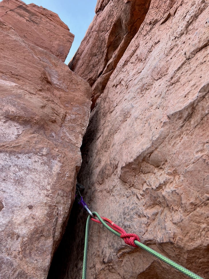 “I brought everything I had,” she says. “The crack was fists to fours, and then it was all chossy and awful, and then it got so wide I didn’t have any gear for it.” Still, she kept going, fighting through off-width sections and a narrow squeeze chimney toward a thinner crack at the top.