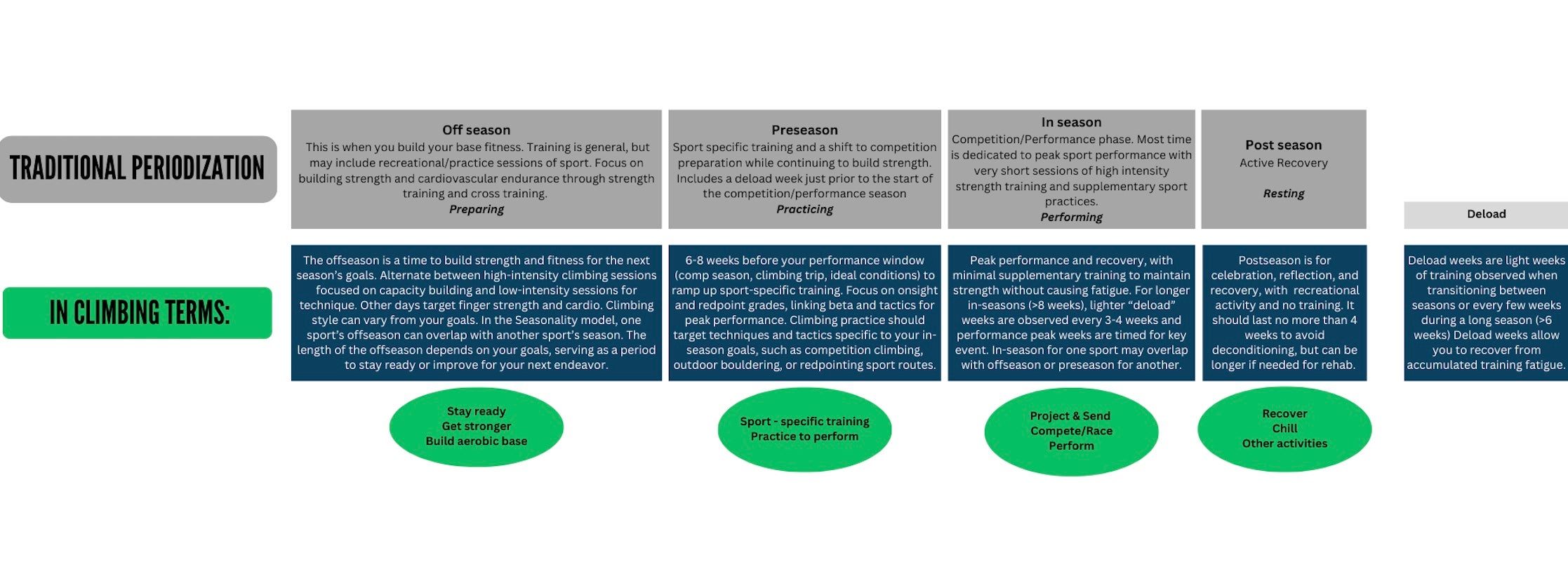 It can feel counterintuitive to decrease climbing frequency in the “Off Season” when your goal is to improve your climbing performance. Each season provides training benefits that build on each other to improve performance. Knowing that there is another season around the corner is reassuring when it feels scary to change your routine for something you’ve dedicated so much time to. The length of a season can vary, but is a period of time that has meaning to you and your pursuits: A semester, the winter months, the youth sport climbing season, the 16 weeks leading up to a marathon, etc.