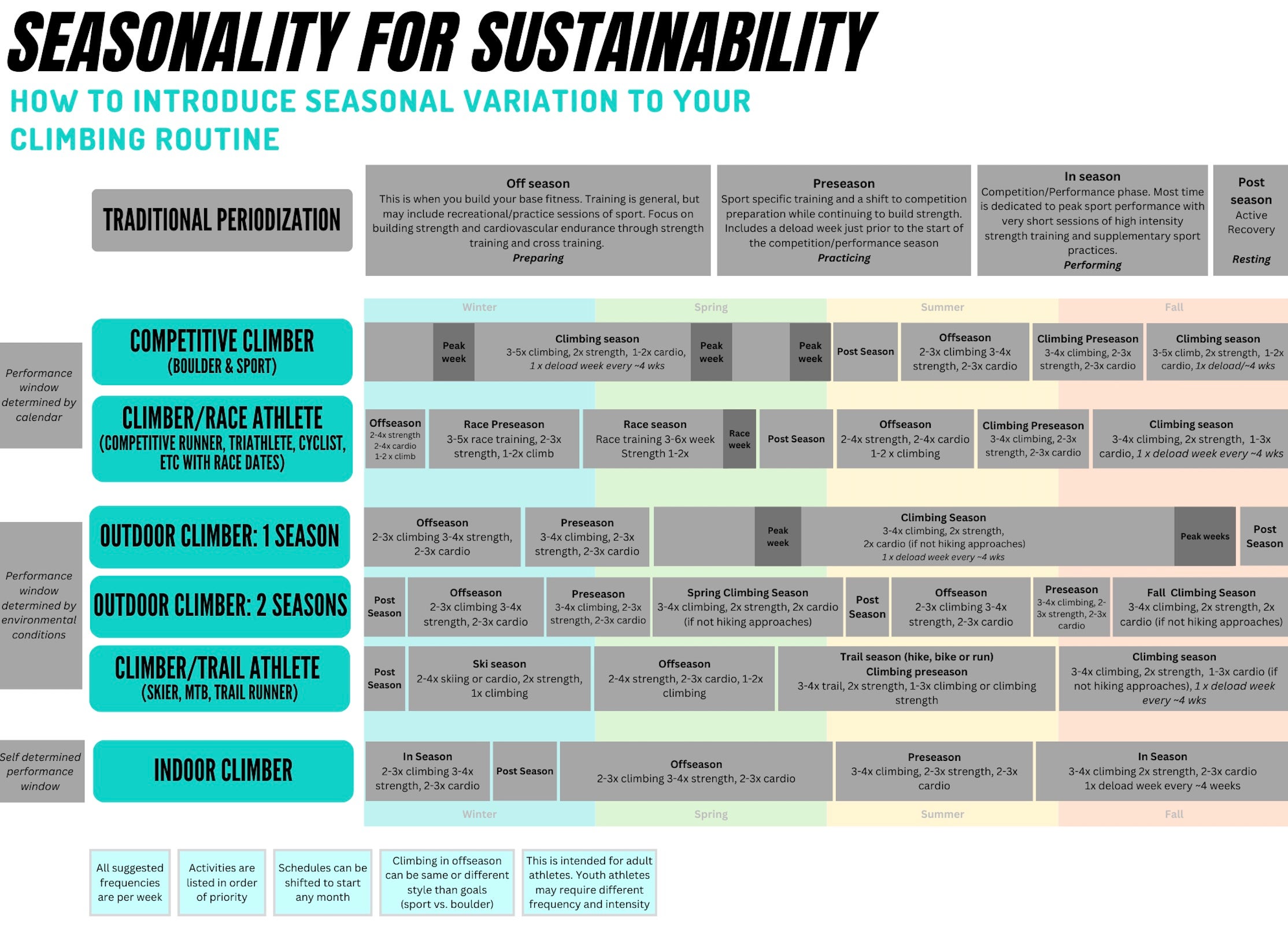 Periodized training works well for athletes with consistent schedules, clear goals, and a predictable timeframe for peak performance, such as a competition season. However, the structure can feel too rigid for climbers who have variation in their schedules, goals, or performance windows—outdoor climbers, multi-sport athletes, and athletes with busy schedules, for example. For this I propose a more organic training structure: Seasonality. Seasonality is structured variation in activity and intensity influenced by personal goals, life circumstances, and weather conditions. Rather than attempting to train for everything at the same time or struggling to stick to a training plan that doesn’t suit your schedule, thinking in seasons can provide perspective on the choice to modify your climbing routine or step away to focus on “off season” pursuits that serve as a building block for the next “climbing season.”