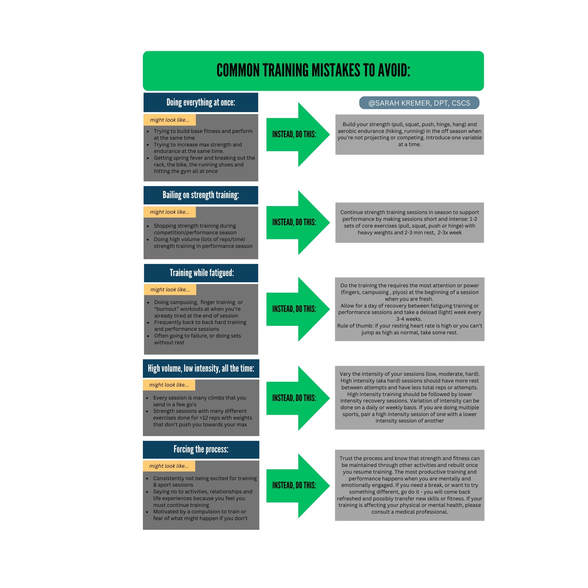 The self-coached climber: One aspect that makes the sport of climbing unique is the number of “self-coached” athletes who participate at a high level. It’s easy to make training mistakes when you don’t have a structured program or the guidance of a coach, so it is especially important to be mindful of the amount of time you dedicate to recovery and cross training. As you plan your seasons of training and performance, consider these common training errors: