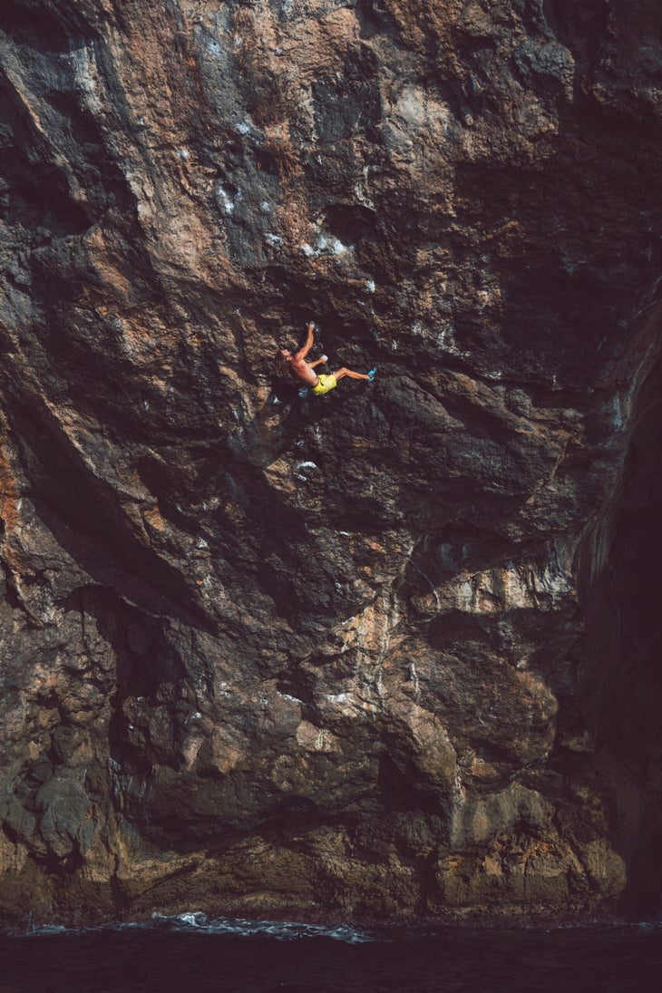 Since spotting Black Pearl, Sharma spent a few days each year attempting the project. Weather proved to be a challenge; summer heat created condensation on the wall. Most Mallorcan routes are fairly straightforward with many positive holds, but Black Pearl features slopey crimps across steep sections. By Sharma’s estimates, the route breaks down into a section of 5.13a/b to a rest, followed by a 15-move crux sequence culminating in a dyno to the pocket—which he says feels like a 5.14b/c into a V9. Finally, Black Pearl concludes with 5.13b/c climbing to the top of the cliff. With no places to chalk up in the crux sequence, Sharma found fall temps to be favorable, even though the water was considerably colder.