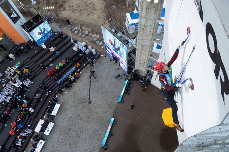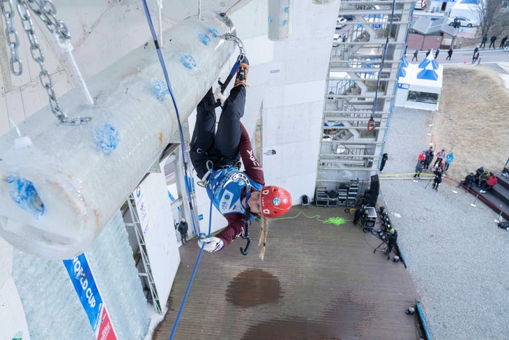 The boulder problem is burly and reachy, forcing the climber to do a full 360 on their tools to switch their grip and angle of attack. That kind of full spin is exhausting, as is using the tools in “reverse grip”—i.e. holding them backward to squeeze out an extra inch or two of reach. For Stylos, the moves were at her absolute limit. She had to cut feet, then reel them back in to reset for the final throw.