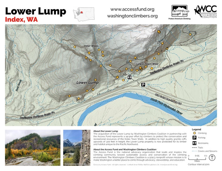 “The WCC was one of the first local climbing organizations to receive a loan through our Climbing Conservation Loan Program for the purchase of the Lower Town Wall,” says Access Fund National Acquisitions Director Brian Tickle. “It’s great to see this acquisition of the Lower Lump magnify the impact Washington climbers have had at Index.”