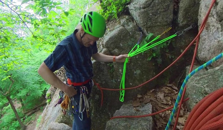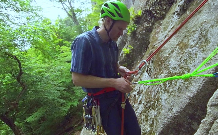 Watch the author demonstrate rapping without a belay device and building a SERENE anchor