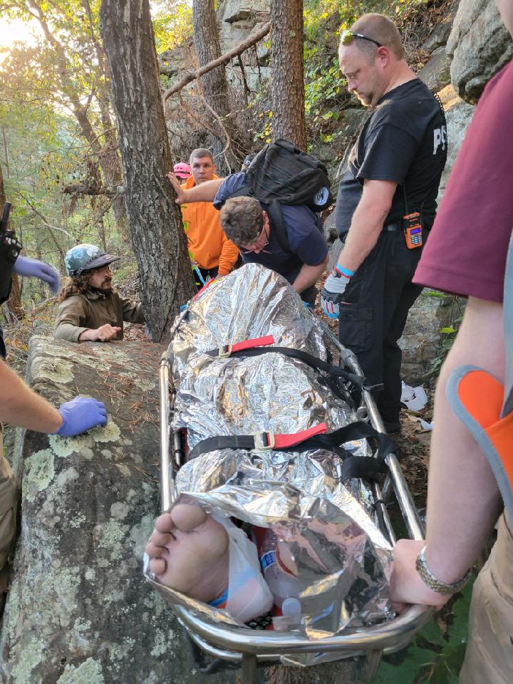 Right away, Stephenson and Koerber could tell Junge’s leg and arm were broken. They were concerned about his back and pelvis, so they jammed a few sticks underneath him for support. Wind gusts of up to 50 mph made an airlift out of the question, so the West Polk County Volunteer Fire and Rescue dispatched seven teams from 14 agencies. Rescuers set up a four-rope system to stabilize and secure Junge as they lowered him down the incline. Furthermore, rescuers also removed trees to cut a straight path down the mountain. In total, nearly 50 people were involved in the rescue.