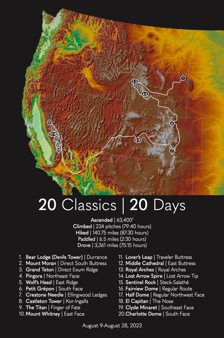 Between August 8 and August 23, 2023, Aidan Multhauf (28) and David Katzenmeyer (33) repeated Hans Florine’s 1993 linkup of 20 Classics in 20 Days. The duo completed the mega linkup to Florine’s team in reverse order, beginning in Wyoming and ending in California. The endeavor totaled 224 pitches of technical rock, 63,000 feet of elevation gain, 140 miles of hiking, 2.5 hours of canoeing, and 3,361 miles of driving.