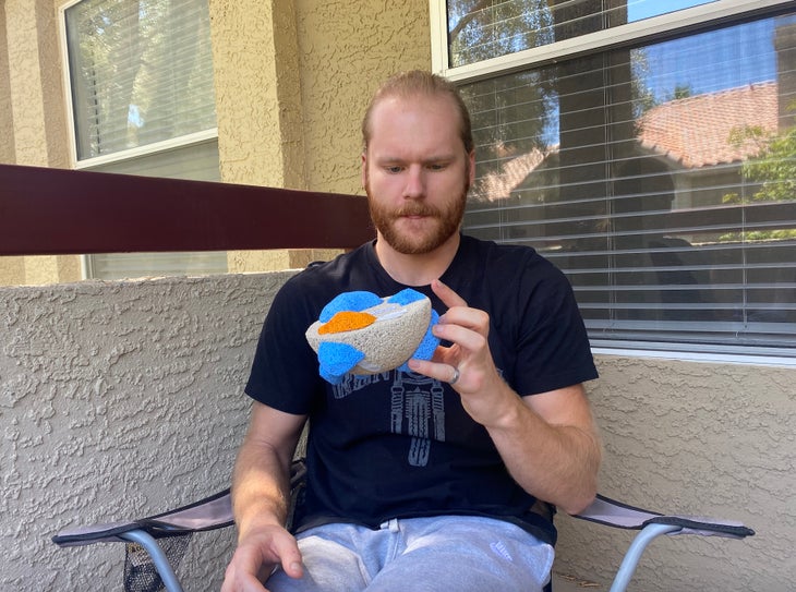 It does require grip and dexterity, and working the problems over and over feels like a bit of a workout, but that’s more because you’re stretching your hand into unique positions than actually challenging your muscles and tendons. The volumes are simply too light. The prototype models Climbing received to test were made from a lightweight, fragile EVA foam, but Karlin plans to upgrade to a heavier, more durable material for the FingerBouldering problems he’ll ship to the public later this year.