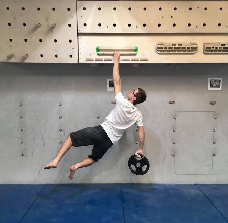 Set up: Max hangs are classically prescribed in the 80-95% range of maximum. For example, if you’re a 150 pound climber whose 5 second test score is with 50 pounds added (200 pound total load), then you’re taking 85% of the total load (200 pounds) and training at that level. This would mean completing all training reps with 20 pounds added, for a total adjusted load of 170 pounds.