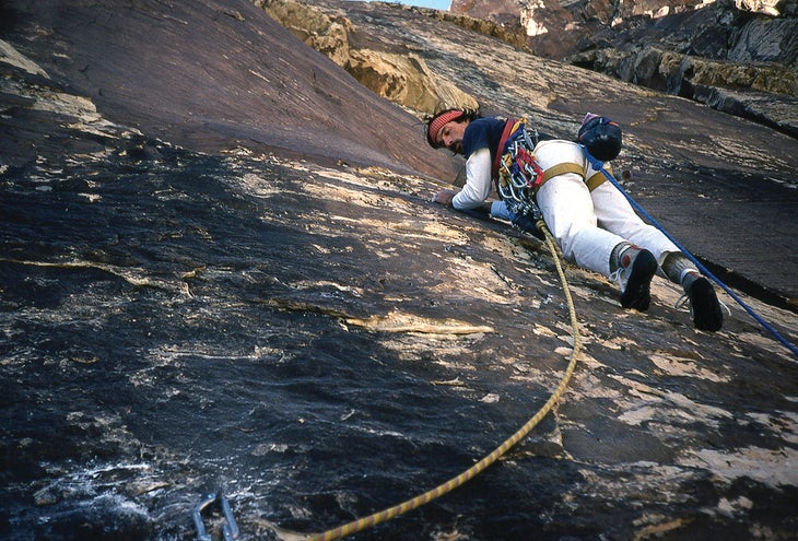 Joe dumped us on the highway with a hand-drawn topo map describing wild burro trails, barrancas and slabs we luckily followed to the base of Windy Peak. We hit a big roof on pitch four, and I traversed out right, slotting a tiny wired Stopper, the first I’d placed, wondering out loud if a wafer of aluminum cabled with a guitar string could possibly hold a fall.