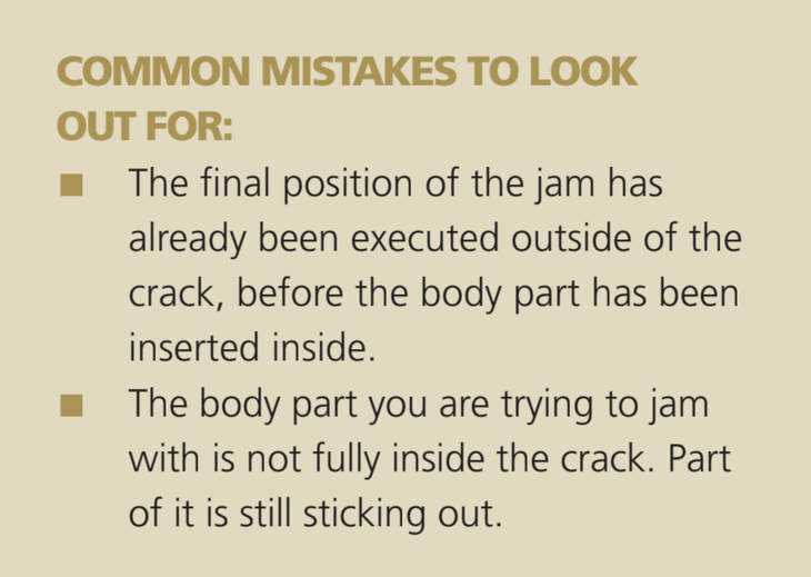 - Fill the space efficiently: insert as much of the body part as possible into the crack before executing the jam.
