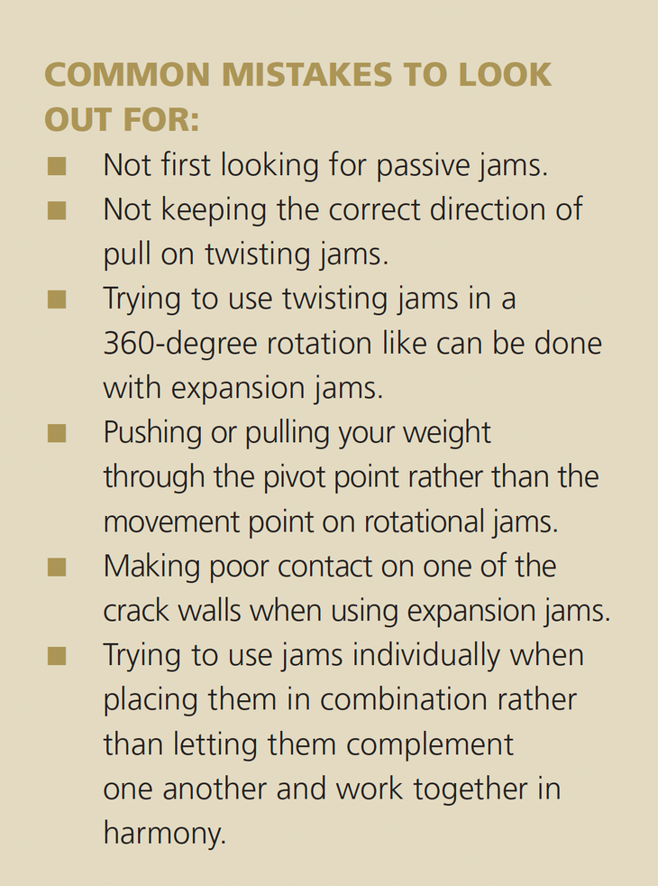 - Your body is a rack of jamming devices: your body has lots of different sizes and shapes and ways of moving and expanding. Use these body “tools” to jam, twist, rotate, and expand to make the jam stick.