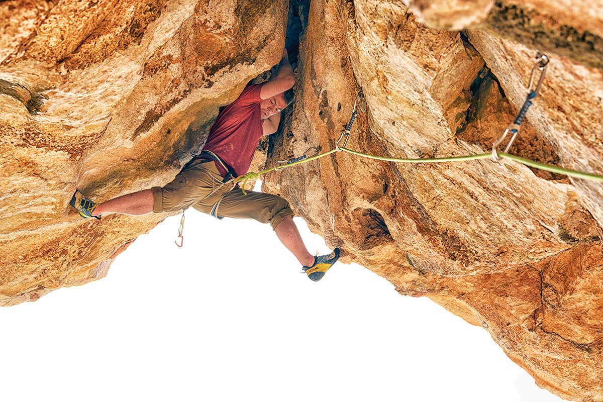 On an adjacent route Ben Rueck was cruising a super steep 13b, but the last-move crux loomed just above him, a rare crimpy sequence, the gatekeeper, and he was resting, shaking out.