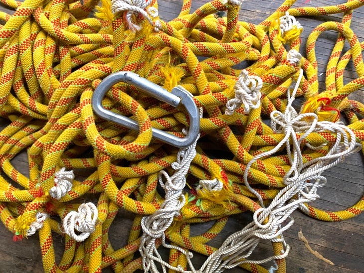 The impact had blown the sheath off the rope and in some places over half the core strands were gone. The oval carabiner the rope was clipped to was bent and the gate was sprung. Least damaged was that guitar strap from Mom’s sewing machine (I’m taking orders if you want me to sew a magic gear sling for you.)