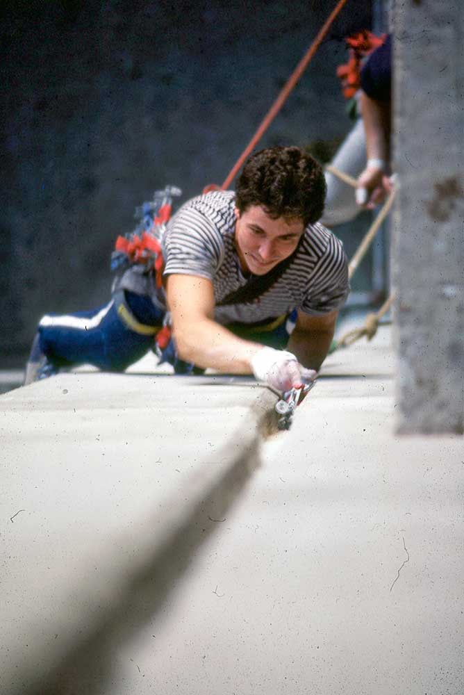 “ZM” was the brainchild of Jim “The Bird” Bridwell, done in ’81 with Peter Mayfield and Charlie Row. Bridwell had worked on it, another one of his masterpieces, for several years, and his fixed ropes had hung so long they had pissed off someone enough to stretch the bottom rope down tight and slice it off as high as they could reach. The cut tail rebounded dozens of feet into the air, out of reach on the overhanging wall.