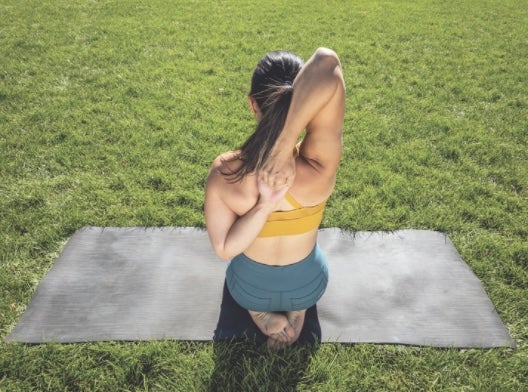 Cow face pose can be intense, so if your shoulders are really tight, grab a towel or strap to hold instead of trying to force your fingers to touch. Bend one arm up and behind your shoulder and bend the other arm down and behind your back. Grab your towel/strap or intertwine your fingers.