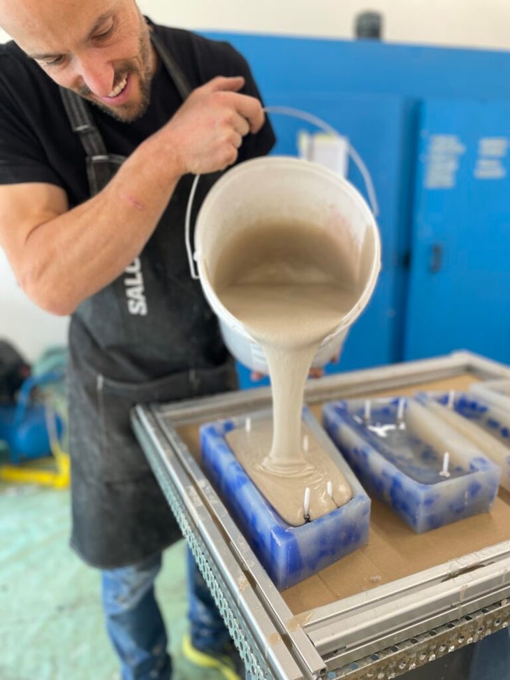 “We are only interested in looking at solutions that are 100% safe,” he explains. So he started searching for ingredients that he’d let his own kids mix together without concern. “It’s so safe, I’d eat it,” Trunz says. “Well—not the quartz, for the sake of my teeth.” After striking out with a number of hardener solutions, he found that mixing bioresins with mineral fillers like sand worked. Not only did it behave like sandstone, but it also felt like sandstone, too.