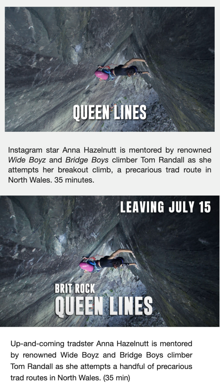 Another example is Reel Rock’s promotion of Anna Hazelnutt and Tom Randall’s 2023 film, Queen Lines, about Hazelnutt making the first female ascent of The Walk of Life (E9 6c or 5.13c R) and sending The Quarryman (E8/5.13b). I still have a copy of Reel Rock’s email: “Instagram star Anna Hazelnutt is mentored by renowned Wide Boyz and Bridge Boys climber Tom Randall as she attempts her breakout climb, a precarious trad route in North Wales.” At the time, Hazelnutt had already climbed 5.14 sport, sent Once Upon a Time in the Southwest (E9 6a or 5.13b/c R), and was mere days away from sending Prinzip Hoffnung (E9/10 or 5.13d/5.14a), which she redpointed that month. For his part, Randall was—and still is—a successful YouTuber, with even more subscribers than Hazelnutt, as well as more followers on Instagram. Yet she was the Instagram star and he the prolific climber. (In response to the backlash, Reel Rock later changed the film description to call Hazelnutt an “up-and-coming tradster” instead of “Instagram star.”)