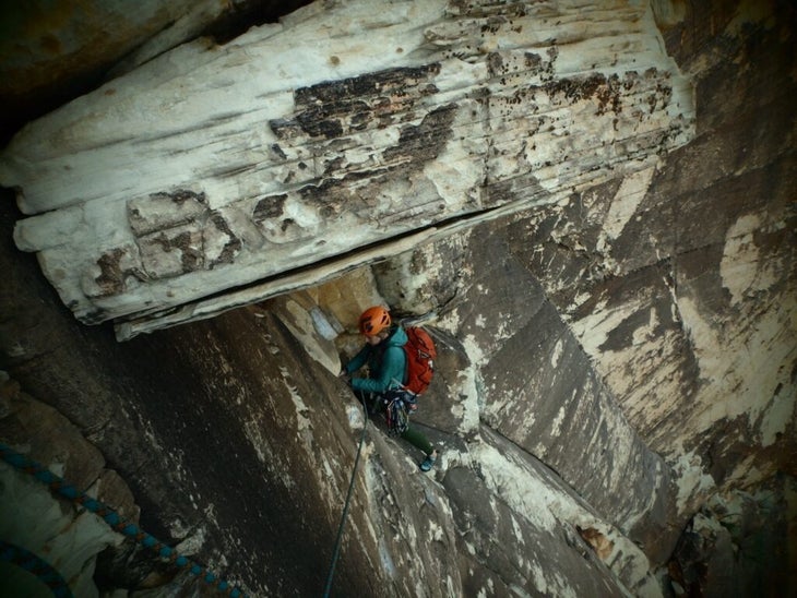 Slowly, though, nervousness creeps in. Two or three shaky gear placements later, I feel a blinding spotlight on the fragility and mortality of it all. I know I will one day die, of course, and I hope it’s not today. I’d venture that this occurs to most of us on multipitch trad routes like this (isn’t it why we’re drawn to the sport?). I climb through a growing nausea and build an anchor at the top of pitch one. I quell the fear with a few deep breaths and an old mantra: Why be alive if we can’t experience life?