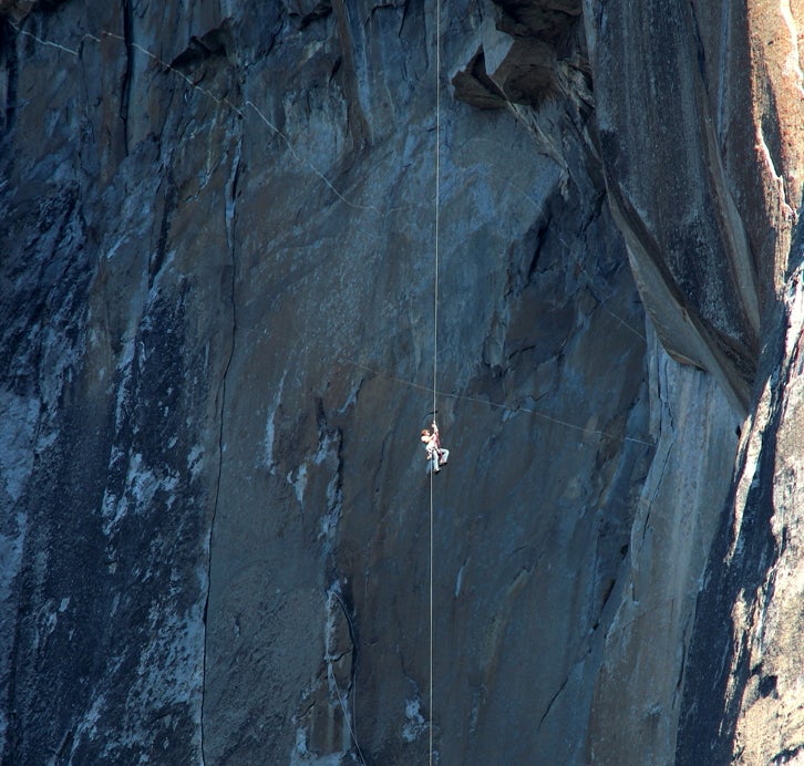 The Shield headwall of Yosemite is a vertical, sheer granite desert and may just be the worst spot to bail on El Capitan. Niels spent the night there, without a portaledge, spinning inside of his haul bag with all his gear clipped to the outside. He swung around in the open air, wrestling with ghosts and rope systems unimaginable. The next morning, he began a series of long and difficult rappels, somehow swinging himself back onto the headwall when necessary to clip in.