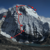 The team climbed the initial 2,300-foot snowfield by headlamp, then tackled the steep rock pillar—of equal length—via traditional big-wall tactics: leader hauling while the seconds jumared. “The first three bivouacs were poor, exposed, and uncomfortable,” the press release states, “but the fourth day took them through the remaining difficulties, which included two vertical 6b [5.10+] rock pitches at 6,600m [21,650ft],” which were led all-free in rock shoes.