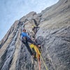 Ryu-shin’s first seven pitches climbed up a pillar on the right side of the wall to reach the face proper. Whittaker described this early climbing as “adventure-y, maybe 5.11, a little bit loose and chossy, just soaking wet. Not great.” Atop the pillar, the team reached a large ledge system and made their first camp. Above, the wall looked blank. “We were just aiming for small grooves, little face holds, following this right-facing corner system in the center of the face,” he said. “A lot of slab moves, hooking, some bird-beaking, with a few R-rated pitches.”