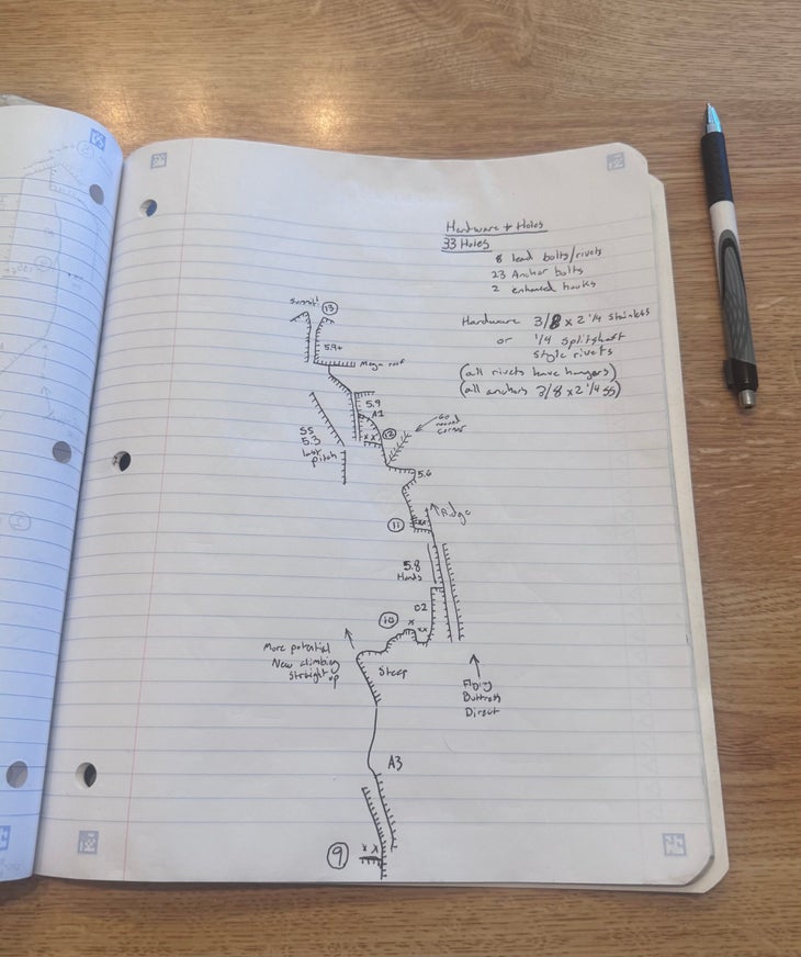 To add anchors to the new terrain, Taylor drilled 33 fixed anchor pieces using a combination of bolts and rivets, with fixed keyhole hangers left in the hopes of increased longevity for future ascents. She had to be careful not to dislodge any large loose rocks with the start of the Steck-Salathé and the popular Four Mile Trail below, making some of the pitches extra stressful. Taylor climbed for six days to establish the route, spending a night on the summit and hiking everything down on the seventh day.
