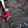 While the column has seams to offer jamming on either side for most of the way, in the last quarter of the pitch the cracks seal up entirely, forcing the climber to full-stem, with both hands and both feet. “When you can’t see what’s coming up, it’s quite hard to commit to such a strenuous approach,” Dufton said. “You have no idea how many moves you’ll have to do like this, and no idea when the next gear placement might come.”