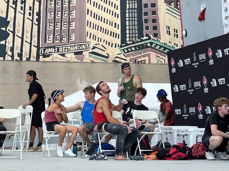 The event took place near downtown Salt Lake, in the lot adjacent to the USA Climbing headquarters. With temps in the mid-80s, over a hundred spectators donned sun hats and made shade with umbrellas, while the competitors burned through chalk. Many came to cheer on a few outdoor crushers and local legends. Among them: Grossman, Michaela Kiersch, Kai Lightner, and Nathaniel Coleman. Chris Sharma, who is considering a path to competing in the 2028 Olympics, had debated entering this comp, but decided to wait until another qualifying event in 2026. The August 2025 NAC consisted of men’s and women’s competitions in both Lead and Speed.