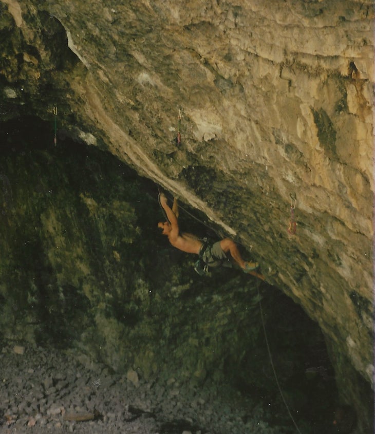 In summer 1992, my friends Scott Leonard and Ryan Sappenfield (aka “Sapper,” the namesake of the popular Sapper Cave up-canyon) bolted a six-bolt line out the cave’s middle pillar, tracing a bicepian symphony of underclings, sidepulls, and tiny crimps on which they could do most—but not all—of the moves. They recruited me that autumn, and when I unlocked the route’s two crux sequences in isolation, I began trying to redpoint it. Because the climb was so bouldery, we’d warm up in an eliminate bouldering cave across the road at the Bauhaus Wall, soaking up morning sun then heading into the crisp autumn shade.
