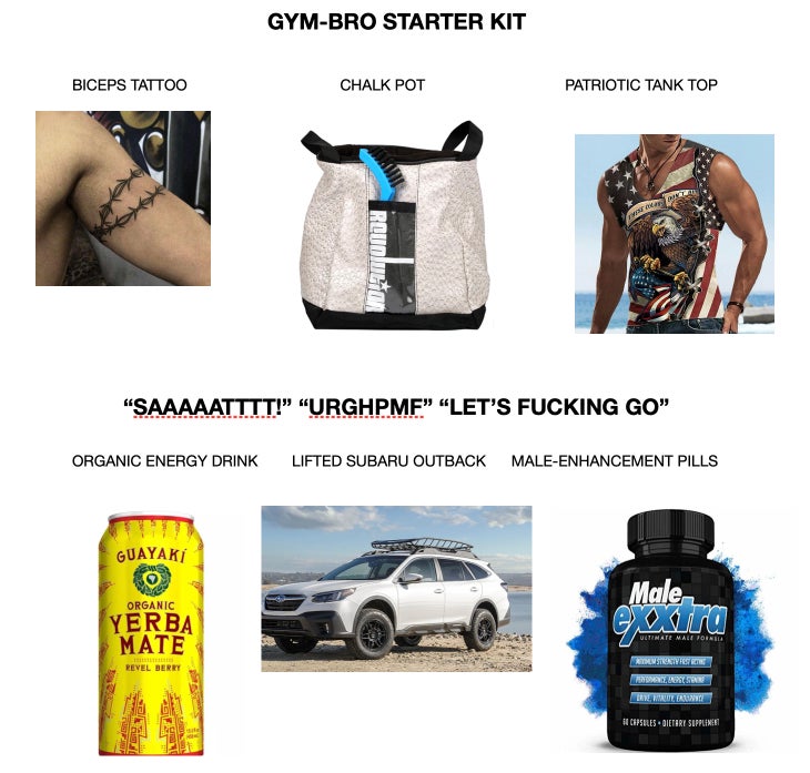 Decades later, starter kits, a.k.a. starter packs a.k.a. starterpacks would become internet memes that rank, for my money, among some of the funniest memes out there, getting directly at the heart of human and animal foibles by showing the various items employed for some of our more absurd, but universally acknowledged, behaviors. Just a couple of gems include the “Where cats like to throw up” starter pack (showing all the carpet and upholstery in a room—but not the hard, easily cleanable surfaces) and the “Kyle Starter Pack,” which takes a head-on dig at overly testosterone’d young bros who wear tank tops, drink Monster Energy, punch holes in drywall, drive man trucks, wear wrap-around shades, etc. You get the idea.