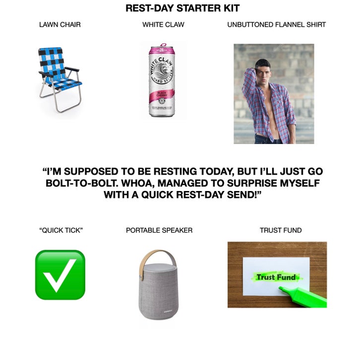 Well, it’s time our little sport got the starter-kit treatment too. I’m surprised we’ve gone this long without there being more incisive memes out there about climbing starter kits, which goes to show that we’re all too busy climbing (a good thing) to talk trash properly (a dying art, IMO, and literally the only form of entertainment on pre-Internet rest days, which would explain why my generation is better at slander than at climbing). I’d also point out that it’s a sad situation when a 51-year-old dad of three who spends his day hiding from the world in his basement or up in obscure gullies on choss first ascents—by design, the most out-of-touch climber in human history–is the person coming up with memes. C’mon, climbing internet, step your game up! I’ve got these six starter kits here, but for sure there are others we could all be coming up with (“Burned-out climbing-writer starter kit” would be one example).
