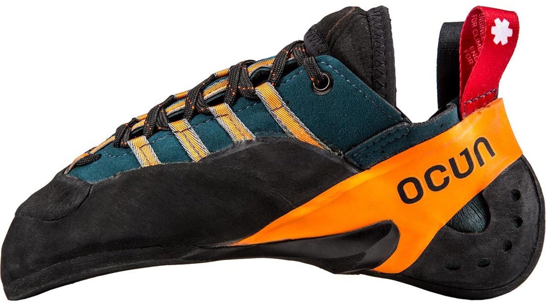 Ocun has done something interesting with the Sigma’s split-sole design, extending the midsole rubber well past the arch and thickening it as it approaches the heel. The result is a shoe that essentially does not bend in the arch area. This gives you a ton of underfoot support when standing on tiny edges. But thanks to its asymmetry and downturn, the Sigma retains just enough under-foot flexibility to (a) bend upward for slopers and toe hooks, and (b) bend downward in a grabbing motion when you’re trying to toe-in on crimps in the steeps.